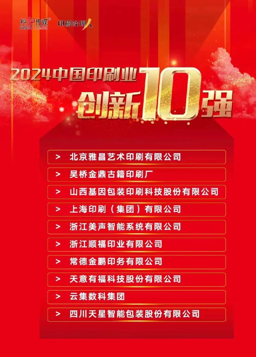 2024中国印刷业创新10强新鲜出炉,我协会会员单位天意有福科技股份有限公司荣获“中国印刷业创新10强”!
